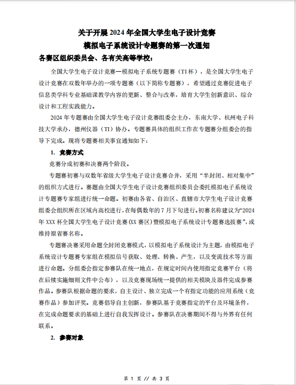 关于开展2024年全国老员工电子设计竞赛模拟电子系统设计专题赛的第一次通知