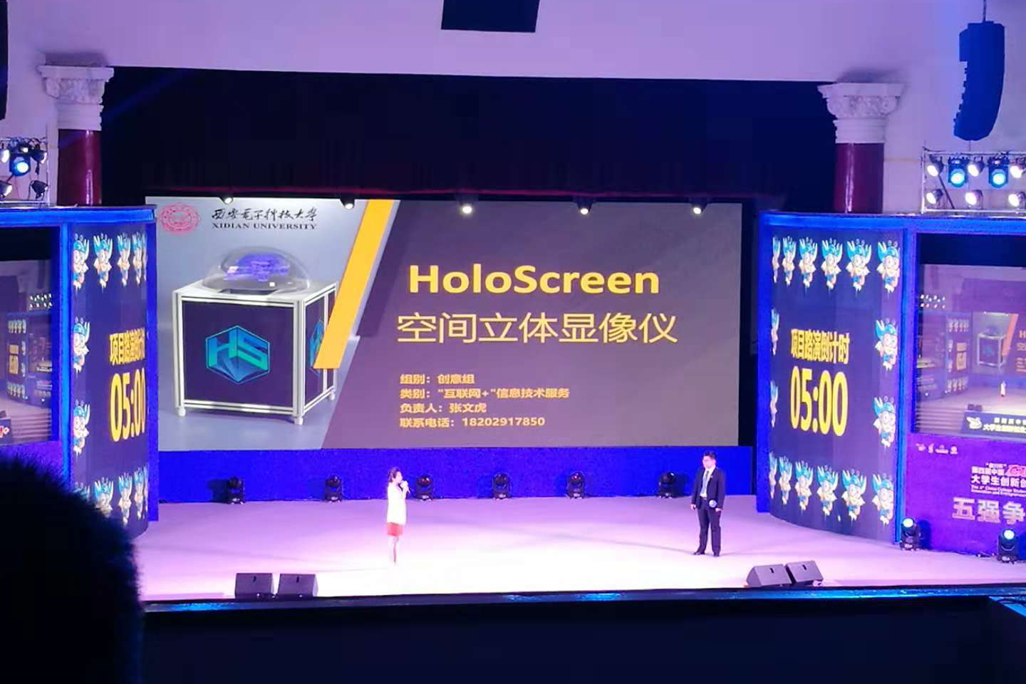 由创新创业实验班一期学员、西电老员工科协副主席、物理与光电工程公司本科生张文虎负责、张文博副教授指导的创业项目《HoloScreen空间立体显像仪》无需任何辅助设备,通过肉眼就可以看到一个无死角的真实三维体,实现裸眼看3D。