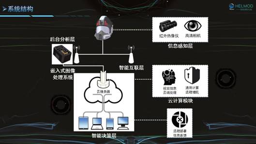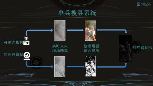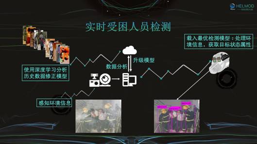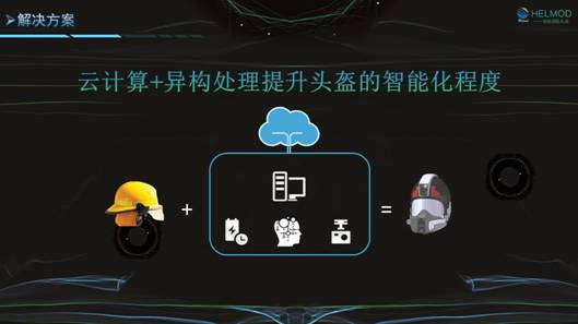 本质上,“Helmod”是一个完整的基于“云计算+异构处理”架构开发的智能安全防护救援系统。在单兵搜寻系统中,通过可见光相机与红外热像仪获取环境信息,经过融合处理,可感知火场内的运动目标轮廓并头盔的AR显示器上,从而把火焰、浓雾的视觉干扰降到最低,实现降低搜寻盲目性的目标。将单兵搜寻与云存储计算结合,记录每次救援的火场信息,并使用深度学习分析历史数据,修正检测模型,可使历史火情都能为后期救援提供经验,实现更为精确的受困人员检测。此外,“Helmod”中的智能互联系统,帮助消防员与总控制台、消防员与消防员之间进行语音通信协作交流,可以更高效的协作,完成救灾任务,对突发事件能做到快速反应和统筹安排,避免火场警员出现单打独斗,掉队失联等情况。